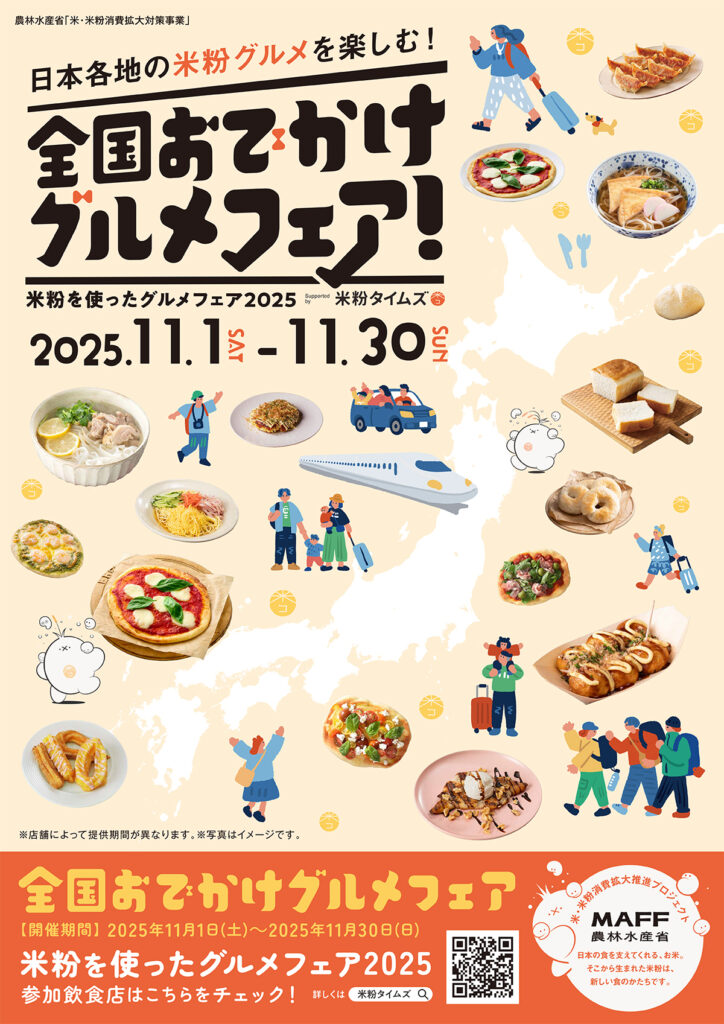 米・米粉消費拡大推進プロジェクト事務局主催の、食欲の秋に、体にやさしく楽しめる米粉グルメを全国各地でお楽しみいただける大規模なフェアです🎉