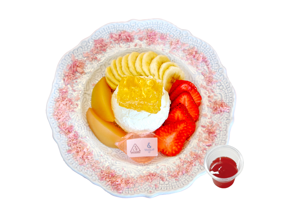 <3CE新作>『グレイジーリップグロウ』の“とろけ出すツヤと蜜感カラー”を、みずみずしいストロベリーソースで表現。当店オリジナルの濃厚なグリークヨーグルトに、甘くてジューシーなフルーツを贅沢にトッピングした、特別な一皿。
